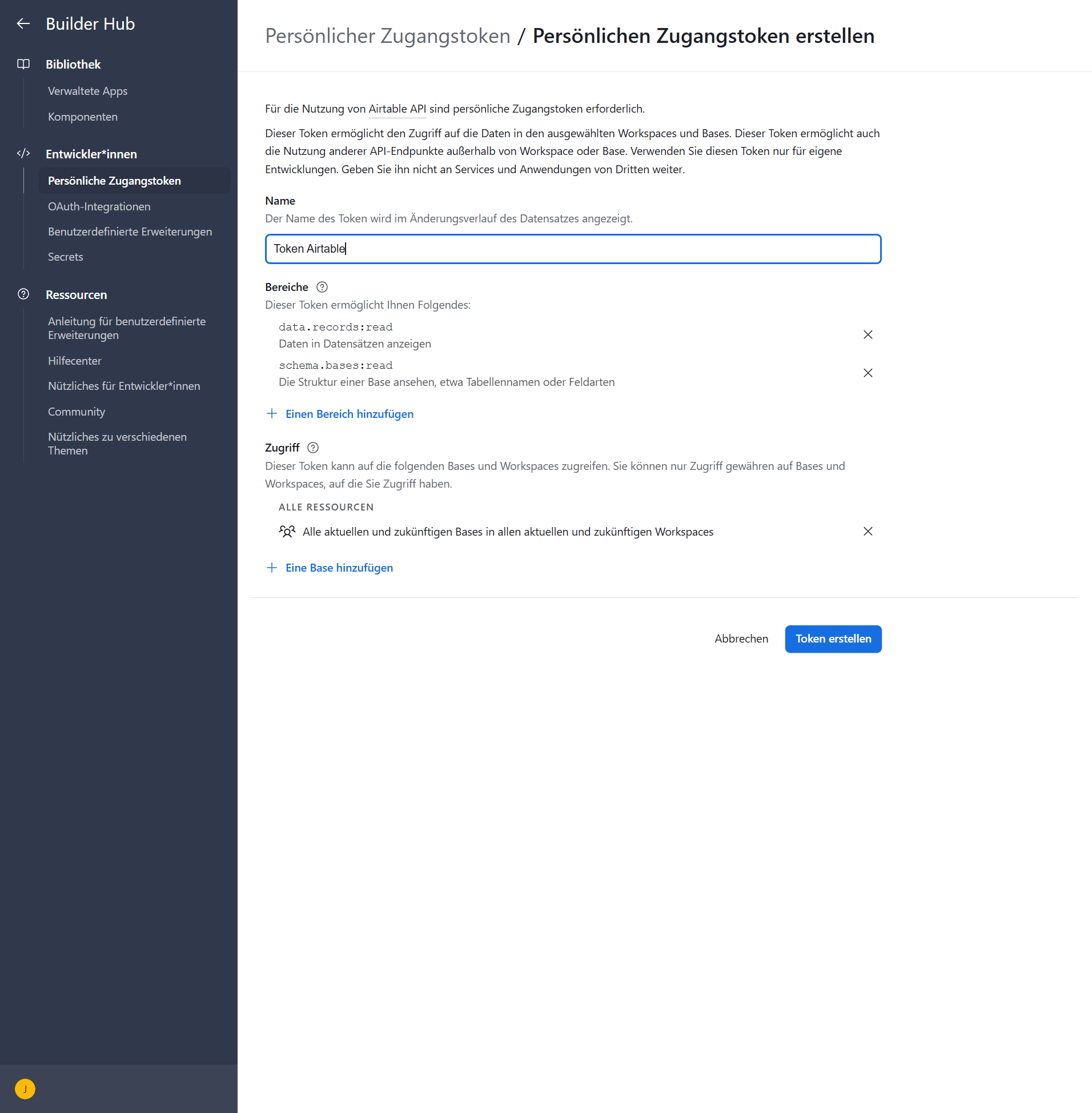 - Visit https://airtable.com/create/tokens