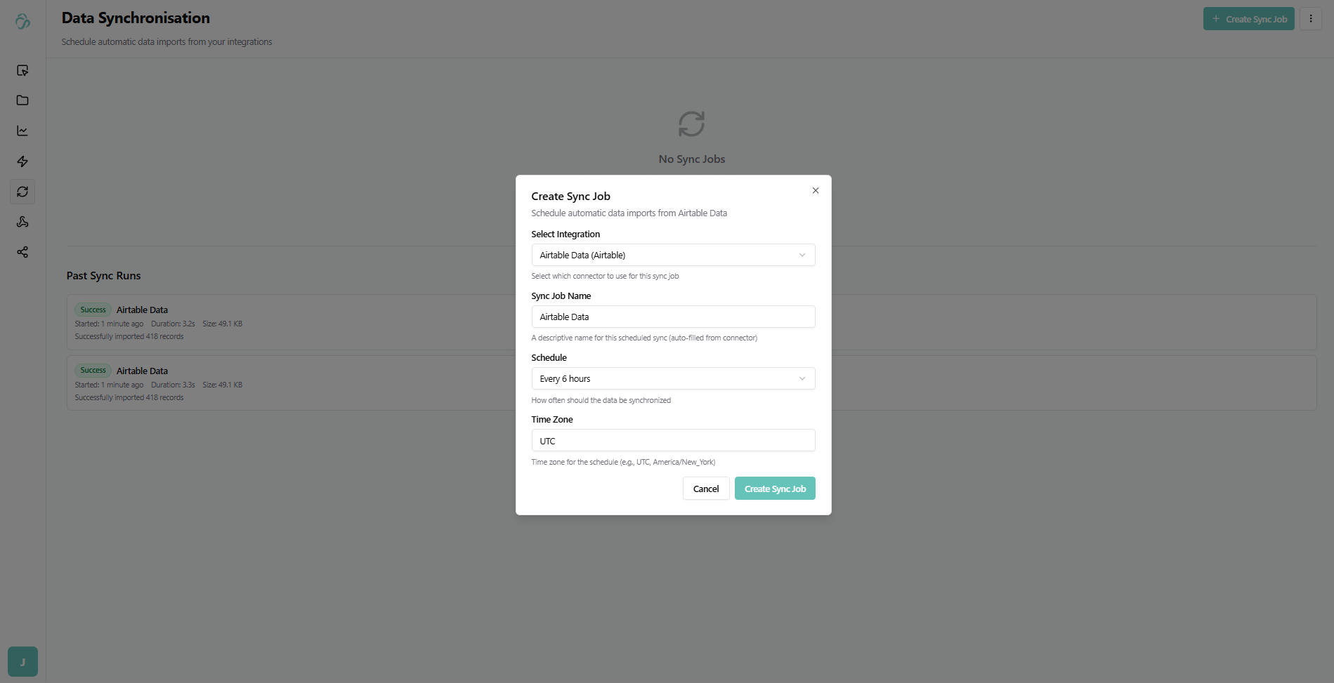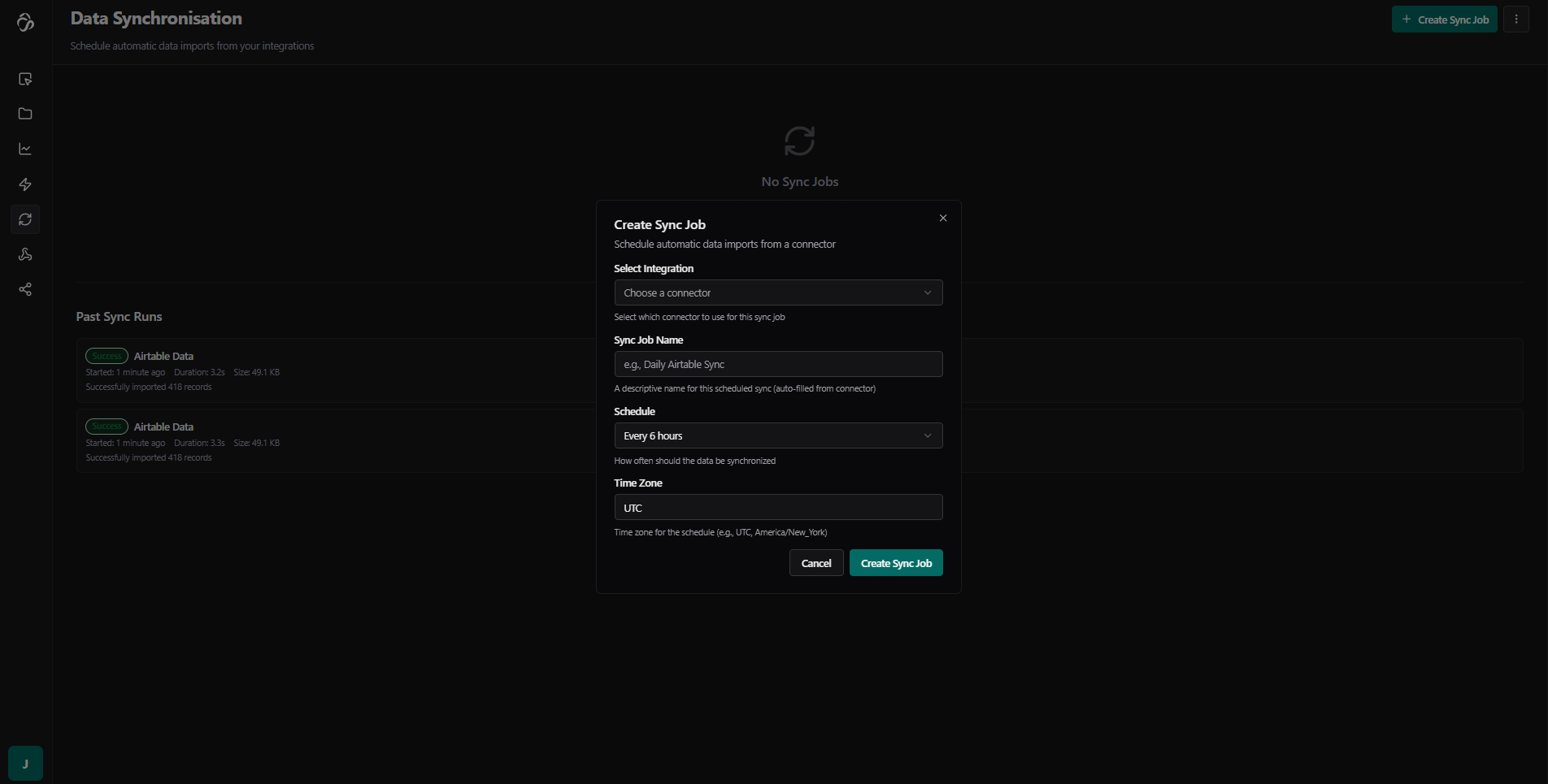 Click Create Sync Job and select the connector you created in the integrations tab from the dropdown. In our case, we created the Airtable connector.