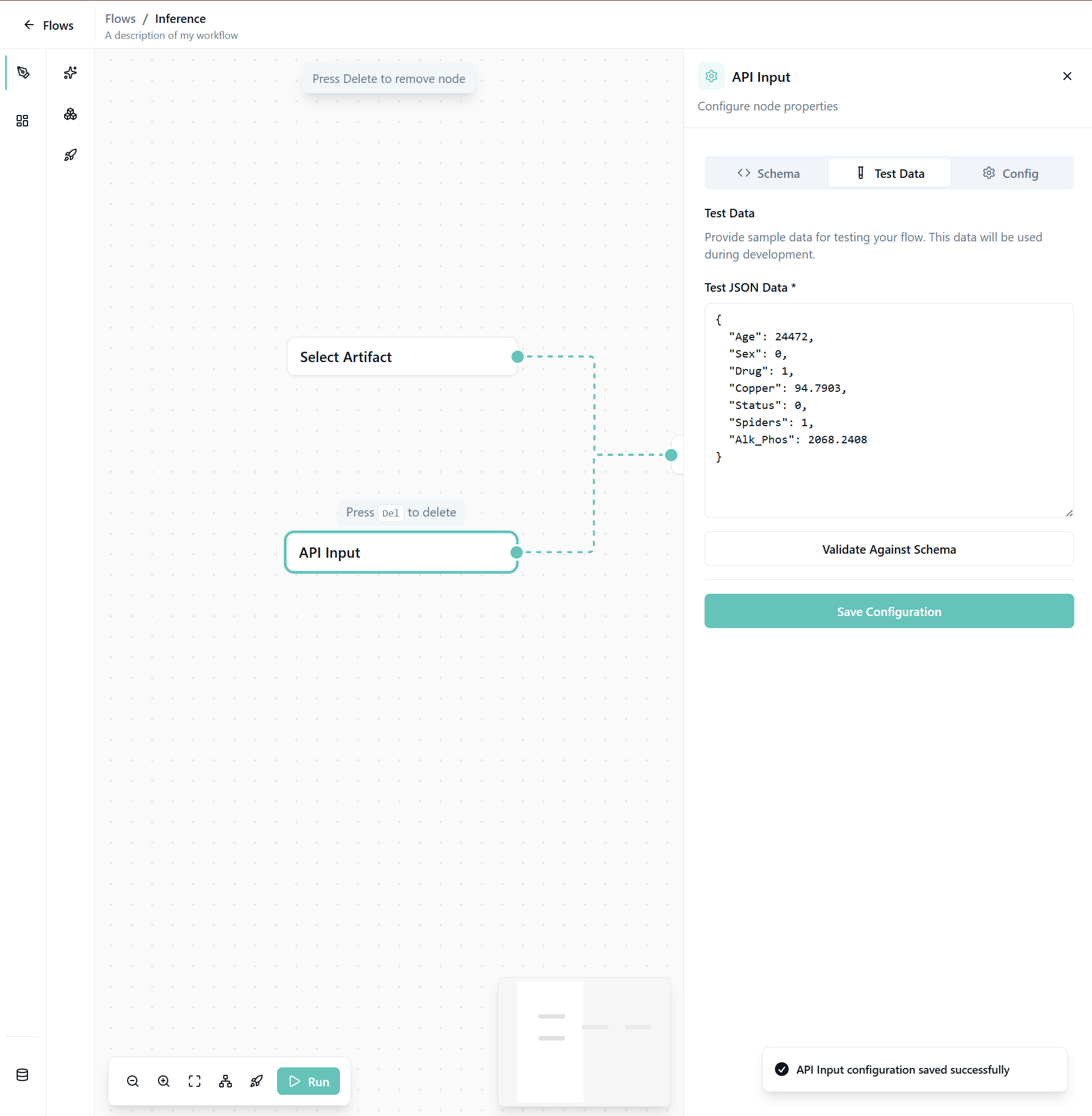 The API Input node defines the structure of data you'll send to the model for predictions.