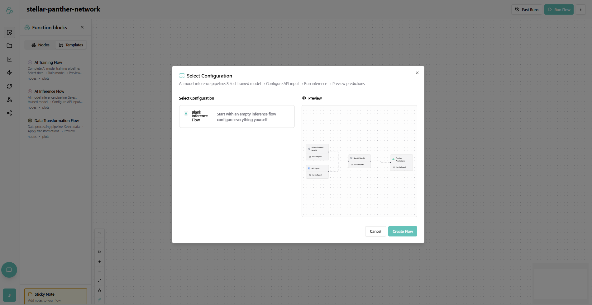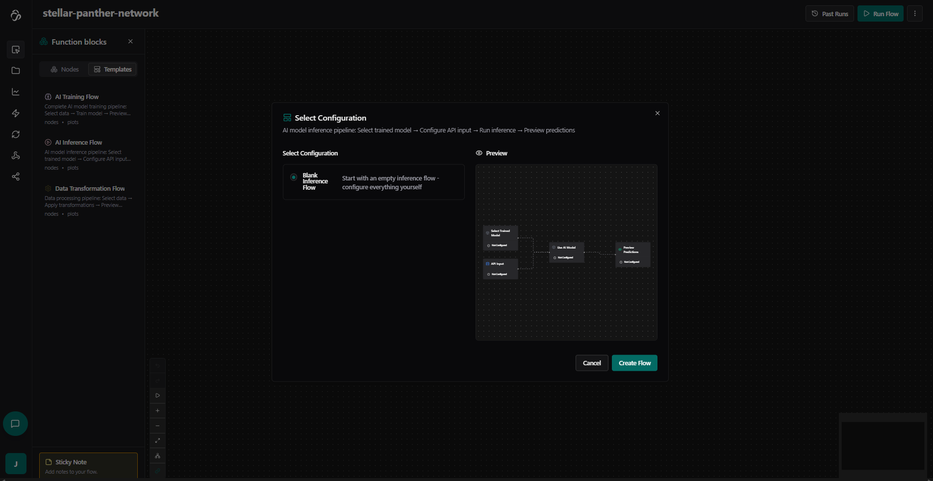 Alternatively you can add them in the chat or from an inference template. Simply select the node luibrary, navigate to the template tab and select Ai Inference Flow. Here we are chooing the blank flow.
