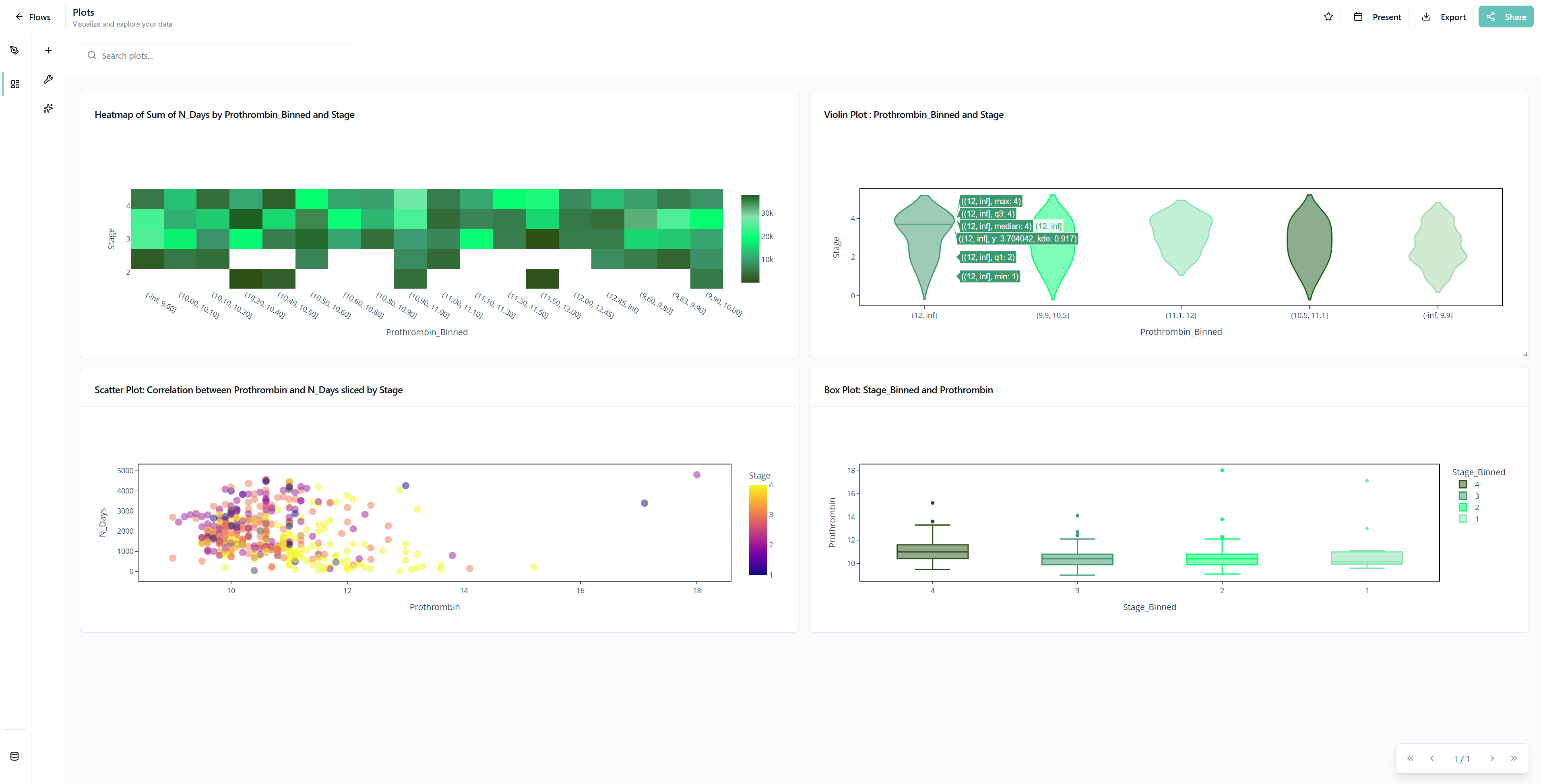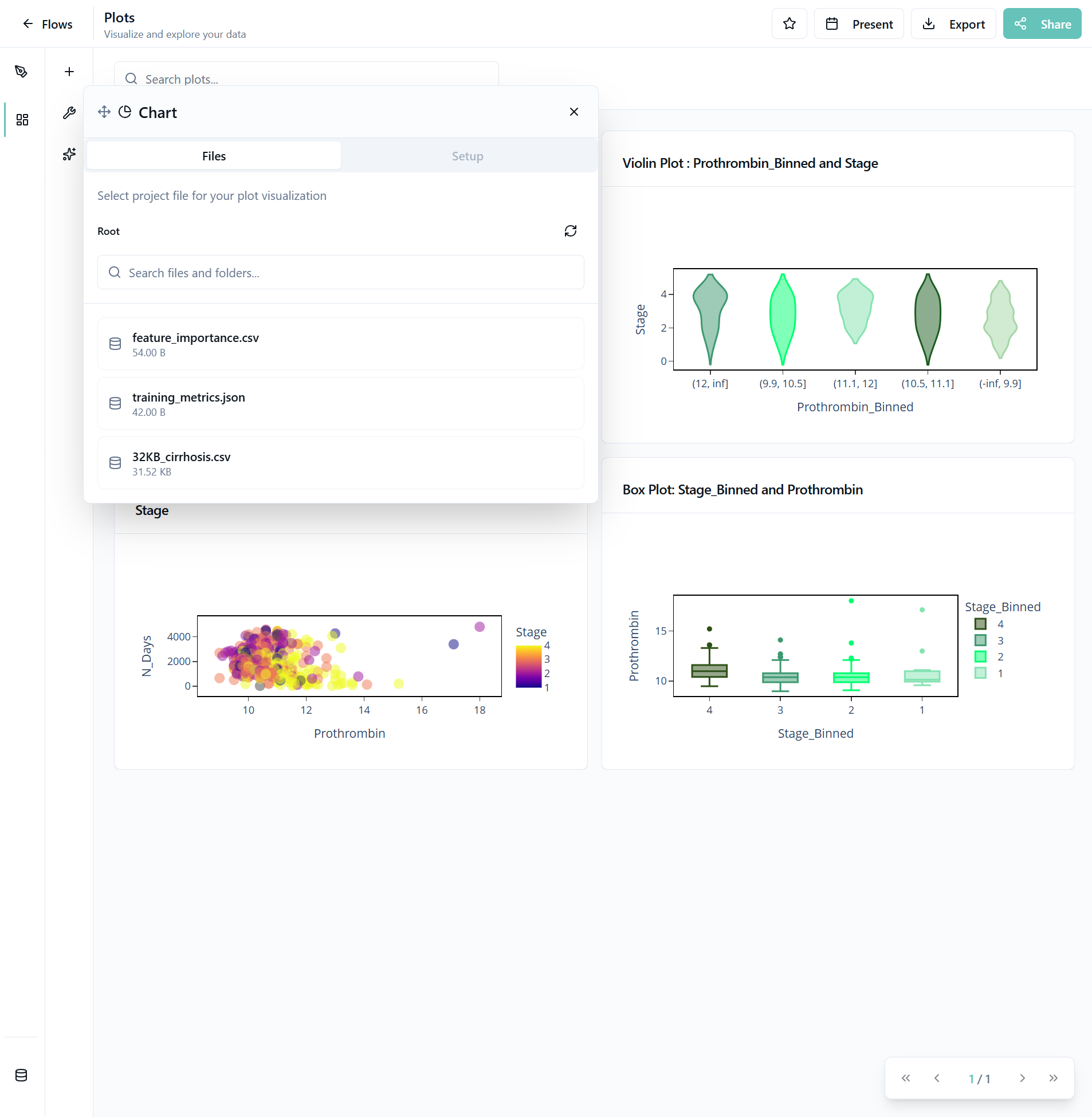 When you're done creating your dashboard, click the present button to view your plots in fullscreen mode. Use the arrows to navigate between plots.